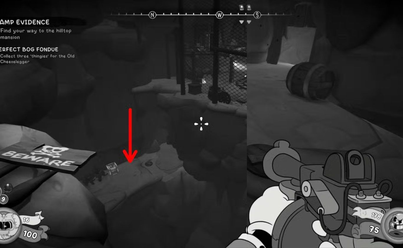 بعد التحدث إلى Old Cheeselegger، ستنتقل إلى جزء آخر من المنجم بعد فترة قصيرة من التقدم. عند دخولك إلى هذه المنطقة الجديدة، لا تتابع السير في المسار الرئيسي مباشرة، بل انظر إلى الأسفل وإلى الجهة اليسرى، حيث يوجد مسار منخفض يمكن الوصول إليه بالقفز. انزل إلى هذا المسار، وستجد الشيء الصغير الأول موضوعًا على الجانب الأيسر منه. من المهم التحرك ببطء في هذه المنطقة والتأكد من تفقد الجوانب، لأن البيئة المظلمة في المناجم قد تجعل العنصر أقل وضوحًا.