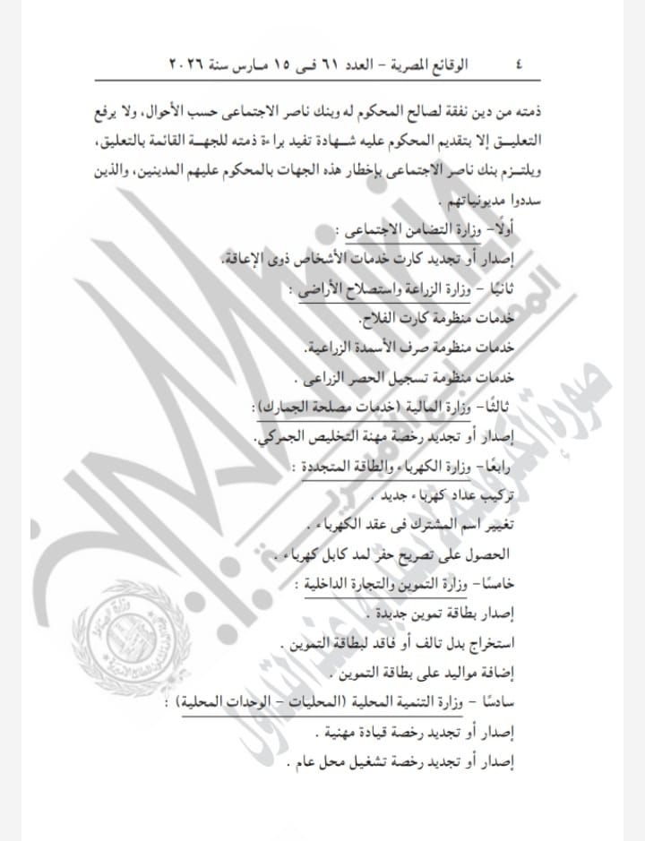 وعن الخدمات الحكومية التي سيتم تعليقها على المحكوم عليهم في قضايا الامتناع عن سداد النفقات أو متجمدات التفقة فهى تشمل: