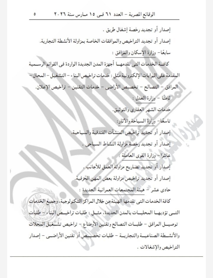 - إصدار أو تجديد رخصة قيادة مهنية، وإصدار أو تجديد رخصة تشغيل محل عام، وإصدار أو تجديد رخصة إشغال طريق، وكذلك التراخيص والموافقات الخاصة بمزاولة الأنشطة التجارية.