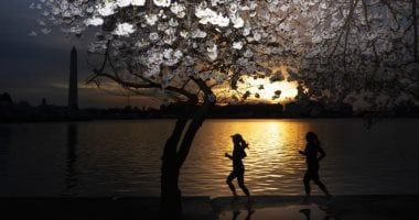 يمارس الناس رياضة الجري بين أشجار الكرز المزهرة في واشنطن