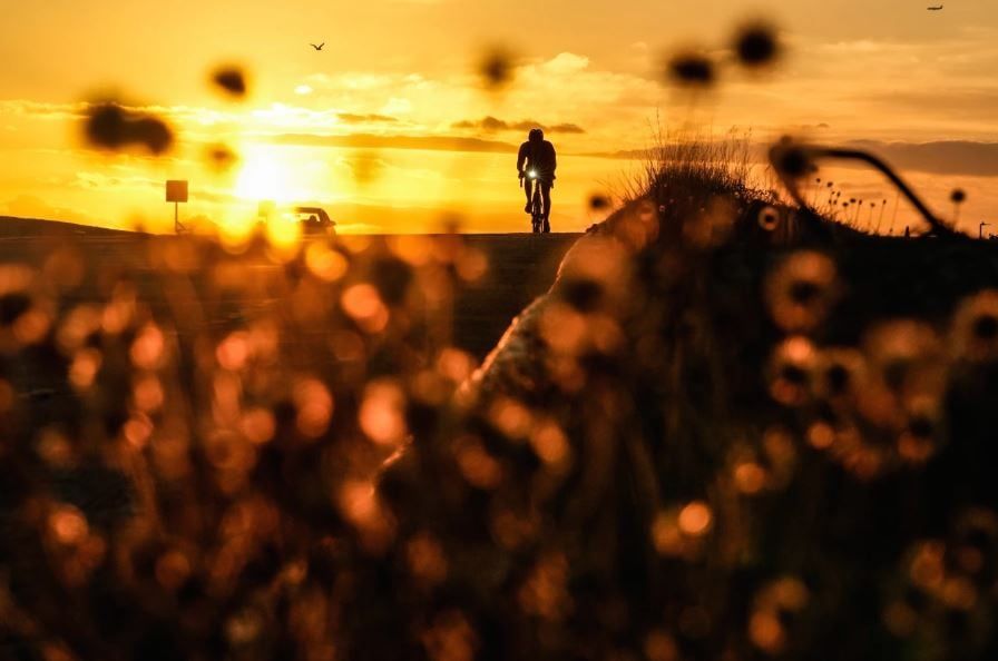 راكب دراجة هوائية يسير على طريق ساحلي عند شروق الشمس في مدينة بنما