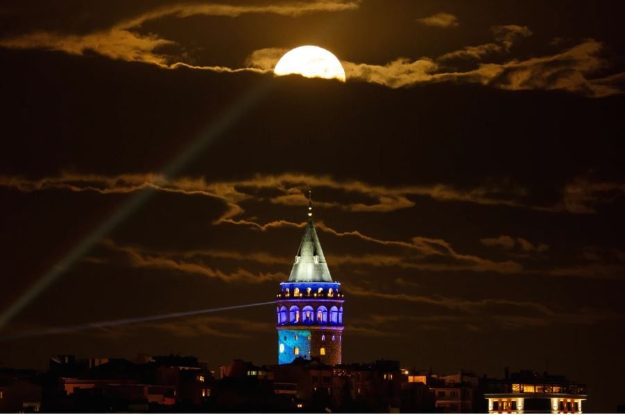 قمر مكتمل خلف برج غلطة في إسطنبول بتركيا