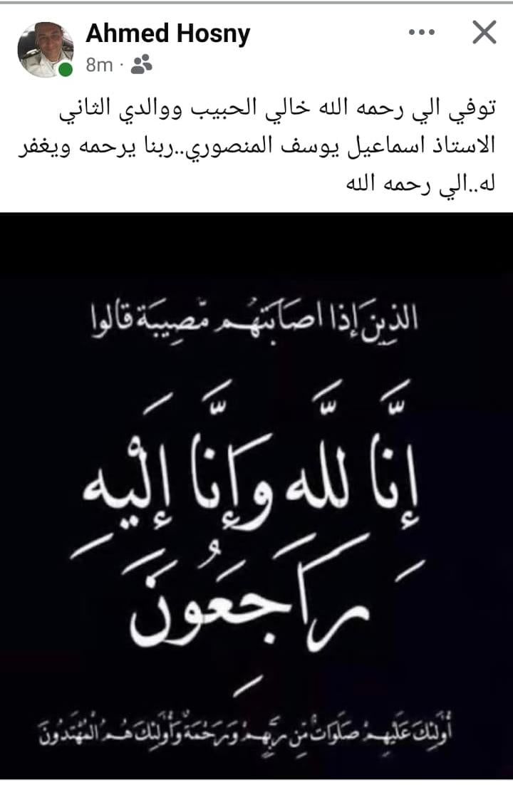 كشف أحمد شقيق الفنان أكرم حسني عن وفاة خالهم من خلال حسابه الرسمي على موقع فيس بوك، وكتب ناعياً إياه: "توفي إلى رحمة الله خالي الحبيب ووالدي الثاني الأستاذ إسماعيل يوسف المنصوري".