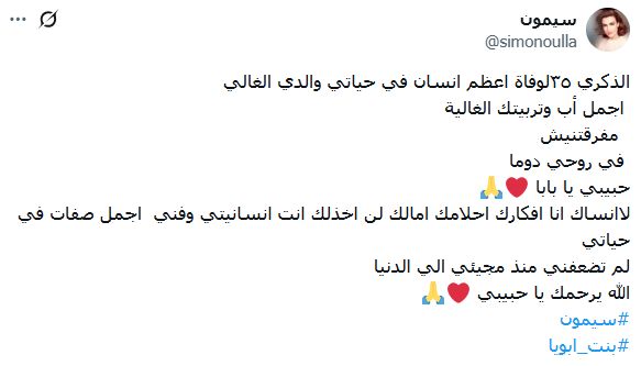 رثاء مليئ بالعاطفة ووفاء مستمرونشرت سيمون عبر حسابها على منصة X، صورا لها مع والدها الراحل خلال فترة طفولتها، صحبتها قائلة: "الذكرى 35 لوفاة أعظم إنسان في حياتي، والدي الغالي أجمل أب وتربيتك الغالية ما فارقتنيش في روحي دوما.. حبيبي يا بابا لا أنساك".