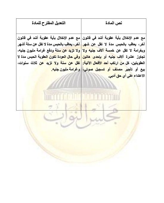 تقدمت النائبة آية عبد الرحمن عضو مجلس النواب بمشروع قانون بتوقيع 60 عضوًا أي "أكثر من عُشر أعضاء المجلس" بتعديل بعض أحكام القانون رقم 82 لسنة 2002 بشأن حماية الملكية الفكرية وتغليظ العقوبات على المزورين، بحيث تصل العقوبة للسجن وغرامة مليون جنيه، وفي حالة تكرار الفعل يتم تشديد العقوبة كما هو مقترح بالتعديل مما يعزز حماية الابداع والإنتاج الفكري وترسيخ سيادة القانون.