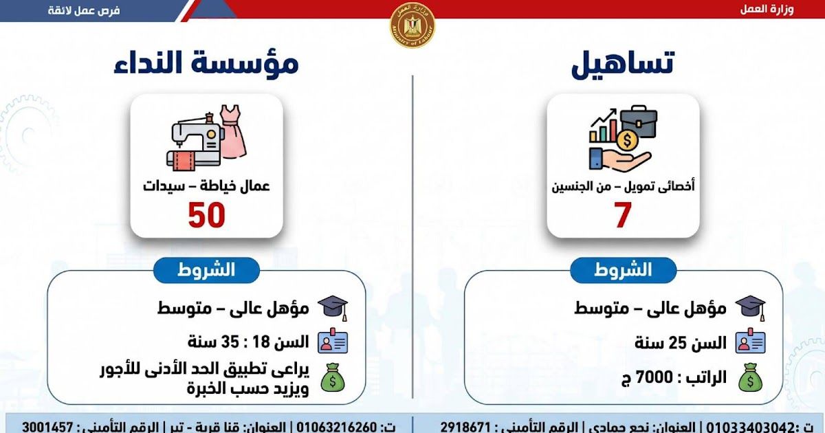وأوضحت وزارة العمل في بيان أن نشرة التوظيف تتضمن فرصًا في عشرات المهن والتخصصات، برواتب مجزية يتم تحديدها وفق طبيعة الوظيفة ونتائج المقابلات الشخصية، مع الالتزام بتطبيق الحد الأدنى للأجور وتوفير مظلة التأمينات الاجتماعية والصحية، بما يضمن بيئة عمل مستقرة تحفظ حقوق العامل وكرامته...كما تشمل النشرة عددًا من الفرص المخصصة لذوي الهمم دعمًا لسياسة الدمج في سوق العمل وإتاحة فرص مناسبة لقدراتهم...وتغطي فرص العمل محافظات: القاهرة، الجيزة، القليوبية، بني سويف، السويس، الأقصر، قنا، جنوب سيناء، وكفر الشيخ، في تخصصات متنوعة تشمل: التسويق، الموارد البشرية، الهندسة (اتصالات وكهرباء)، الميكانيكا والتحكم الكهربائي، الصيانة، المحاسبة، الإشراف الفني والموقعي، الإنتاج، المشتريات، المبيعات، الجودة، الأمن، المخازن، القيادة برخص مختلفة، الفندقة والمطاعم، إلى جانب عدد من الأعمال الإنتاجية والخدمية الأخرى...