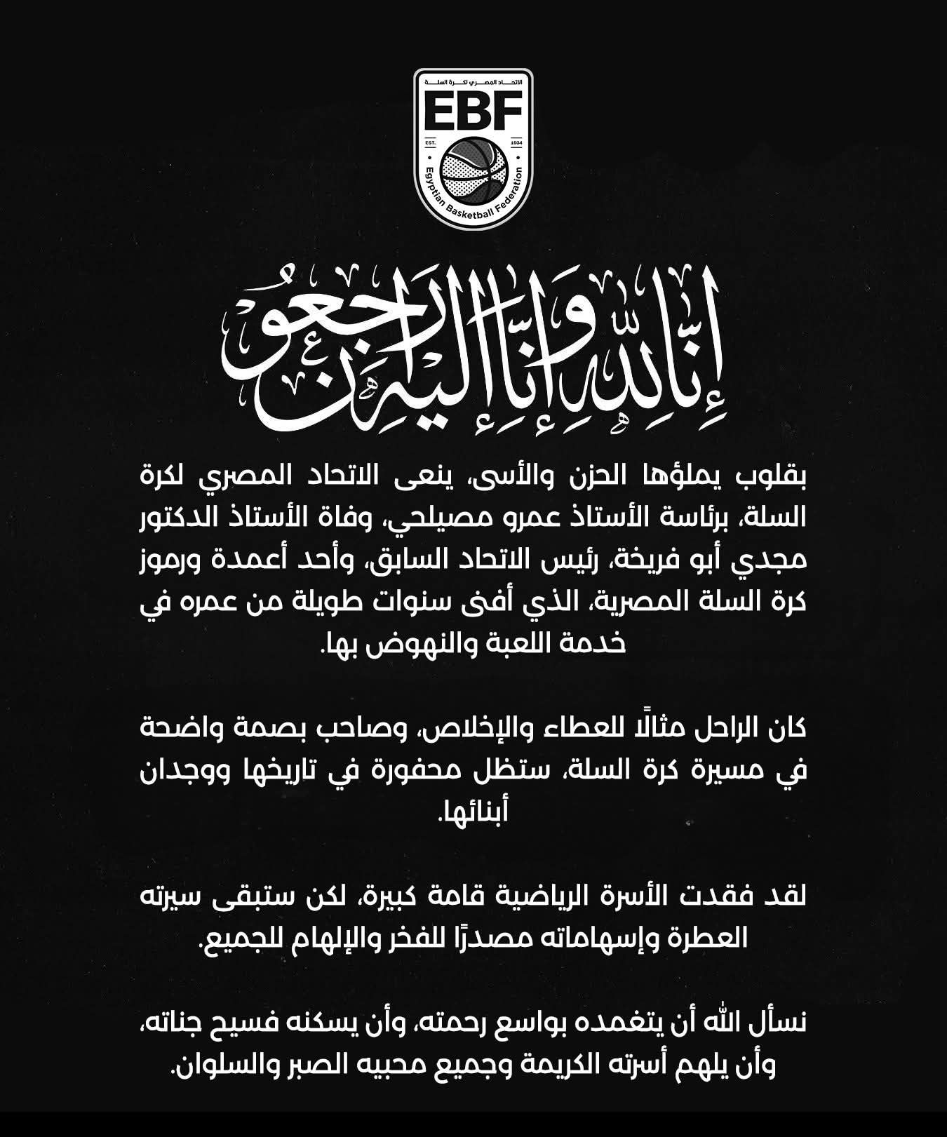 الثلاثاء، 21 أبريل 2026 09:45 منعى اتحاد كرة السلة برئاسة عمرو مصيلحى، وفاة الدكتور مجدى أبو فريخة رئيس الاتحاد السابق، الذى توفى اليوم اثر أزمة قلبية مفاجأة.