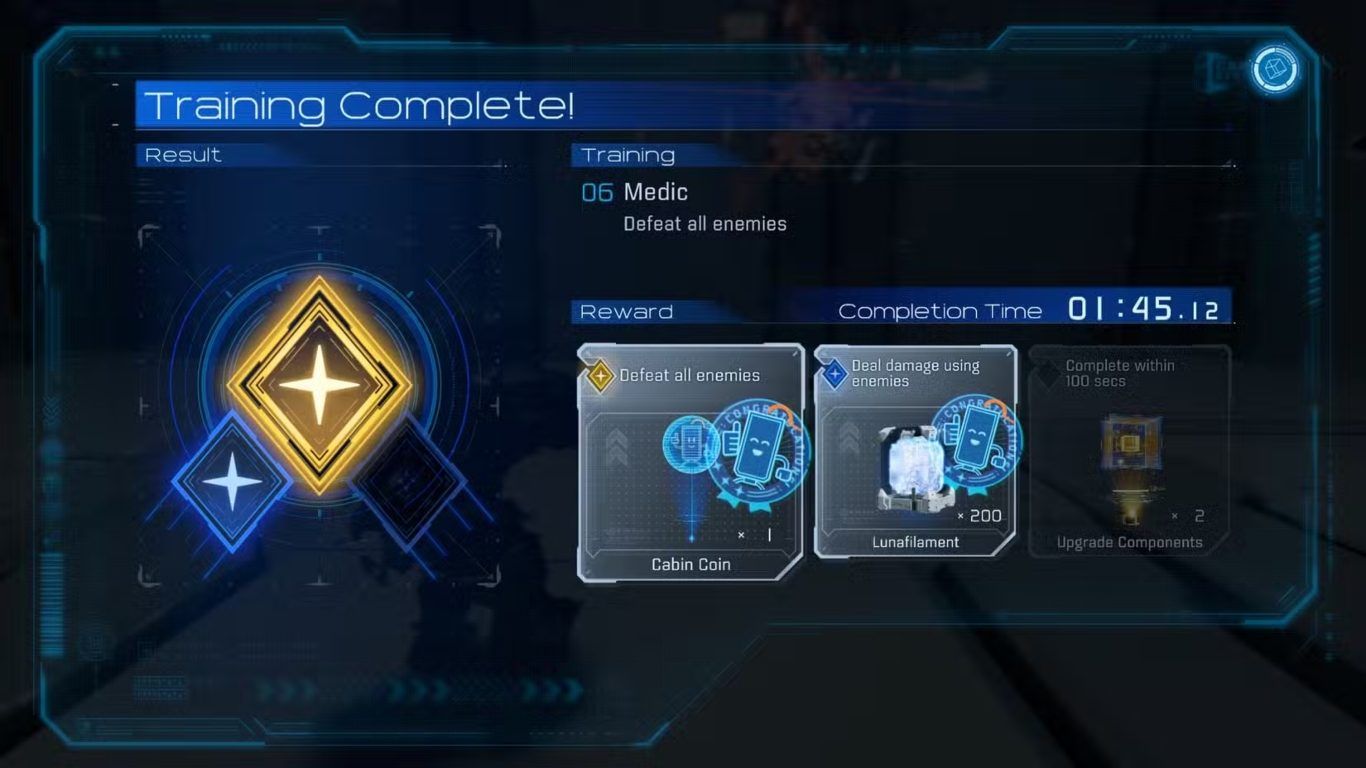 وتتضمن Training Simulation 6 Medic 3 أهداف رئيسية يجب تحقيقها بالكامل. الهدف الأول هو القضاء على جميع الأعداء وهو هدف مباشر يركز على إنهاء كل الخصوم الموجودين داخل التحدي دون ترك أي عدو حي وعند إتمامه يحصل اللاعب على 1 Cabin Coin. أما الهدف الثاني فهو إلحاق الضرر باستخدام الأعداء وهو من الأهداف التي قد تبدو غير واضحة في البداية لكنه يمنح مكافأة قيمة تتمثل في 200 Lunafilament وهو ما يجعله من الأهداف المهمة جدًا داخل هذه المحاكاة. والهدف الثالث يتمثل في إنهاء التحدي خلال 100 ثانية فقط وعند تحقيق هذا الشرط يحصل اللاعب على 2 Upgrade Components.