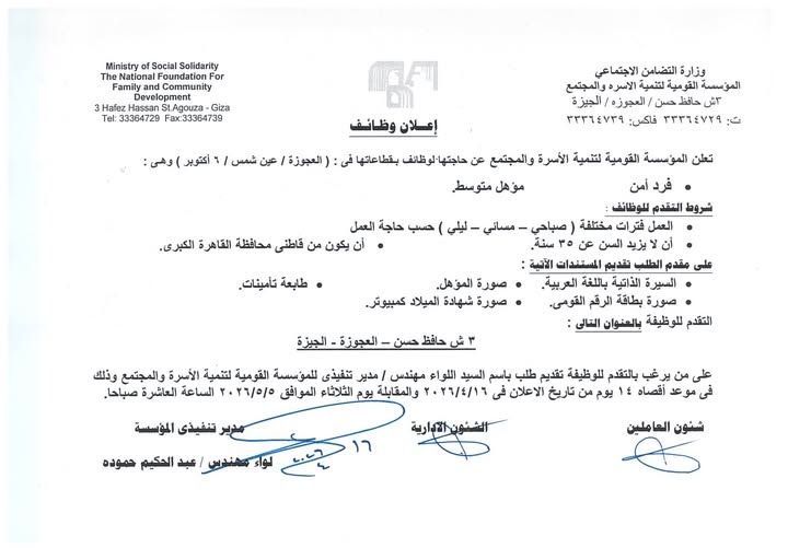 على من يرغب بالتقدم للوظيفة تقديم طلب باسم السيد اللواء مهندس / مدير تنفيذي للمؤسسة القومية لتنمية الأسرة والمجتمع وذلك في موعد أقصاه ١٤ يوم من تاريخ الاعلان في ١٦/٤/٢٠٢٦ والمقابلة يوم الثلاثاء الموافق ٥/٥/٢٠٢٦ الساعة العاشرة صباحاً.