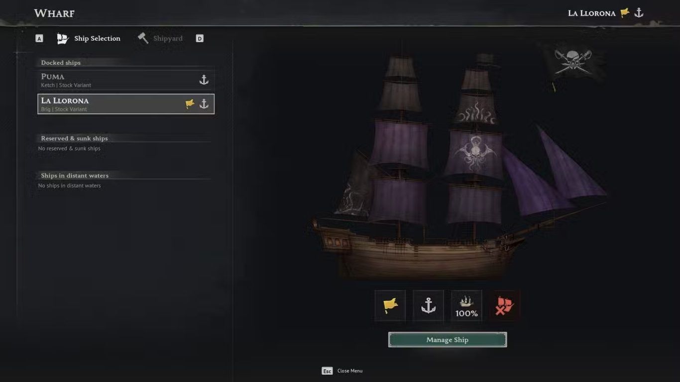 بعد وضع Wharf في أي موقع مناسب على امتداد الساحل ثم التفاعل معه ستظهر أمامك قائمة Ship Selection. ومن خلال هذه القائمة تستطيع اختيار السفينة التي تريد اعتمادها بوصفها Flagship الخاصة بك. كما يمكنك أيضا الانتقال إلى شاشة Shipyard حيث يصبح من الممكن صناعة سفن جديدة باستخدام أي مخططات تصنيع قمت بفتحها أو شرائها من قبل. وهذه الخطوة تمنح اللاعب قدرا كبيرا من الحرية في إدارة أسطوله البحري لأنها لا تقتصر على اختيار السفينة الحالية فقط بل تمتد أيضا إلى توسيع مجموعة السفن المتاحة لديه مع التقدم داخل اللعبة.