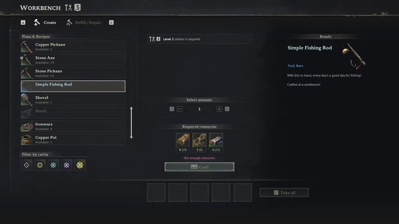 ولكي تتمكن من صناعة Simple Fishing Rod يجب أولا ترقية Workbench في Windrose. ويمكن فعل ذلك عن طريق بناء Sawhorse أو Toolbox داخل نطاق التأثير الخاص بـ Bonfire. وبمجرد وضع أي واحد من هذين العنصرين داخل هذه المنطقة فإن مستوى أي Workbench موجود في قاعدتك سيرتفع بمقدار 1. وهذه الخطوة ضرورية جدا لأن صناعة Simple Fishing Rod تتطلب أن يكون لديك Workbench بالمستوى 2 على الأقل. وهذا يعني أن اللاعب لا يستطيع ببساطة التوجه إلى Workbench الأساسي وصناعة الصنارة فورا بل يجب عليه قبل ذلك تحسين بيئة العمل والوصول إلى المستوى المطلوب.