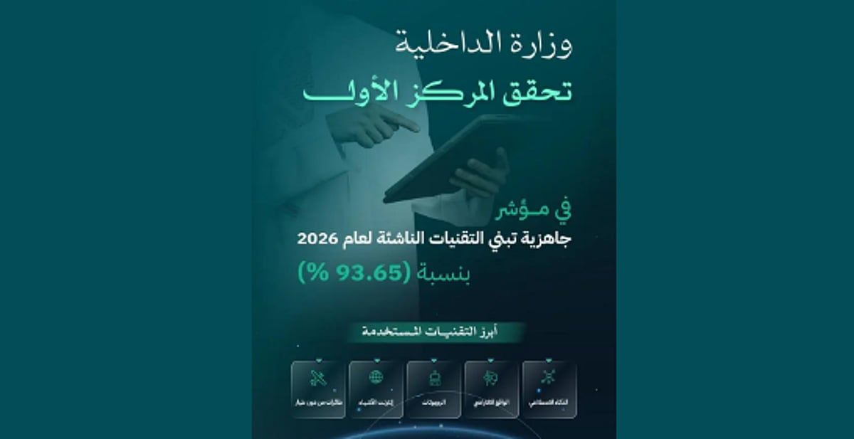 حققت وزارة الداخلية المركز الأول في مؤشر جاهزية تبني التقنيات الناشئة بنسبة (93.65%)، وذلك ضمن نتائج تقرير هيئة الحكومة الرقمية في دورته الرابعة لعام 2026م.