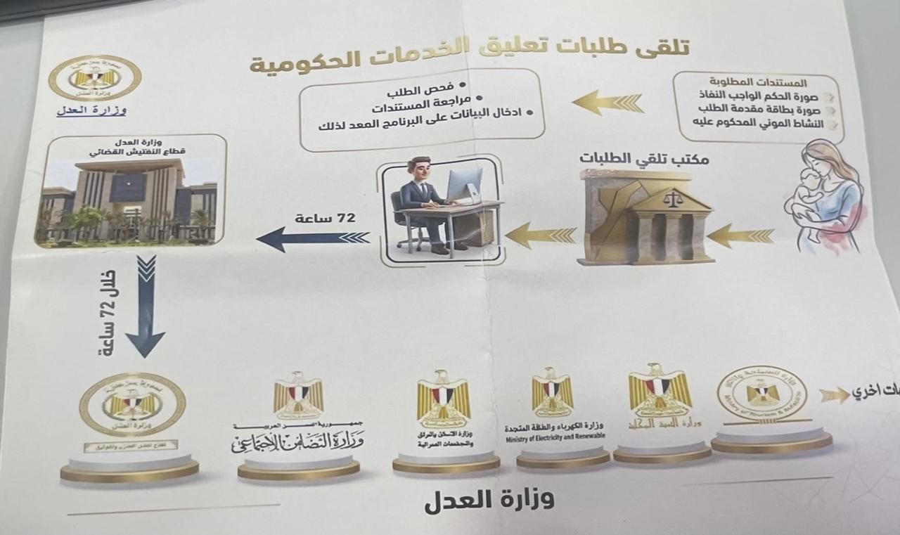 وخصصت كل محكمة ابتدائية على مستوى الجمهورية غرفة لتلقى شكاوى المستحقين النفقة سواء نفقة زوجات أو أطفال أو لسكن الحاضن، حيث يشترط لتعليق الخدمات الحكومية عن الممتنعين عن سداد النفقة أن يتم تقديم شكوى بعد صور الحكم بثلاثة أشهر إلى هذا المكتب الذى تم ربطه بجميع قاعدة بيانات الجهات والوزارات صاحبة الخدمات الحكومية التى سيتم تعليقها بالنسبة لمن لم يسدد.
