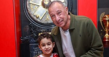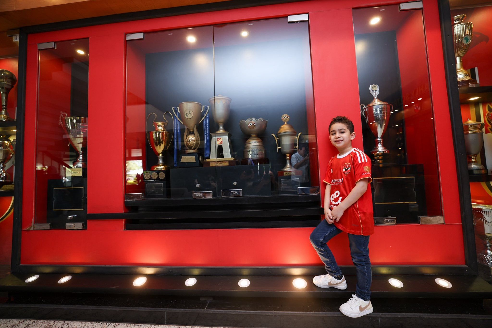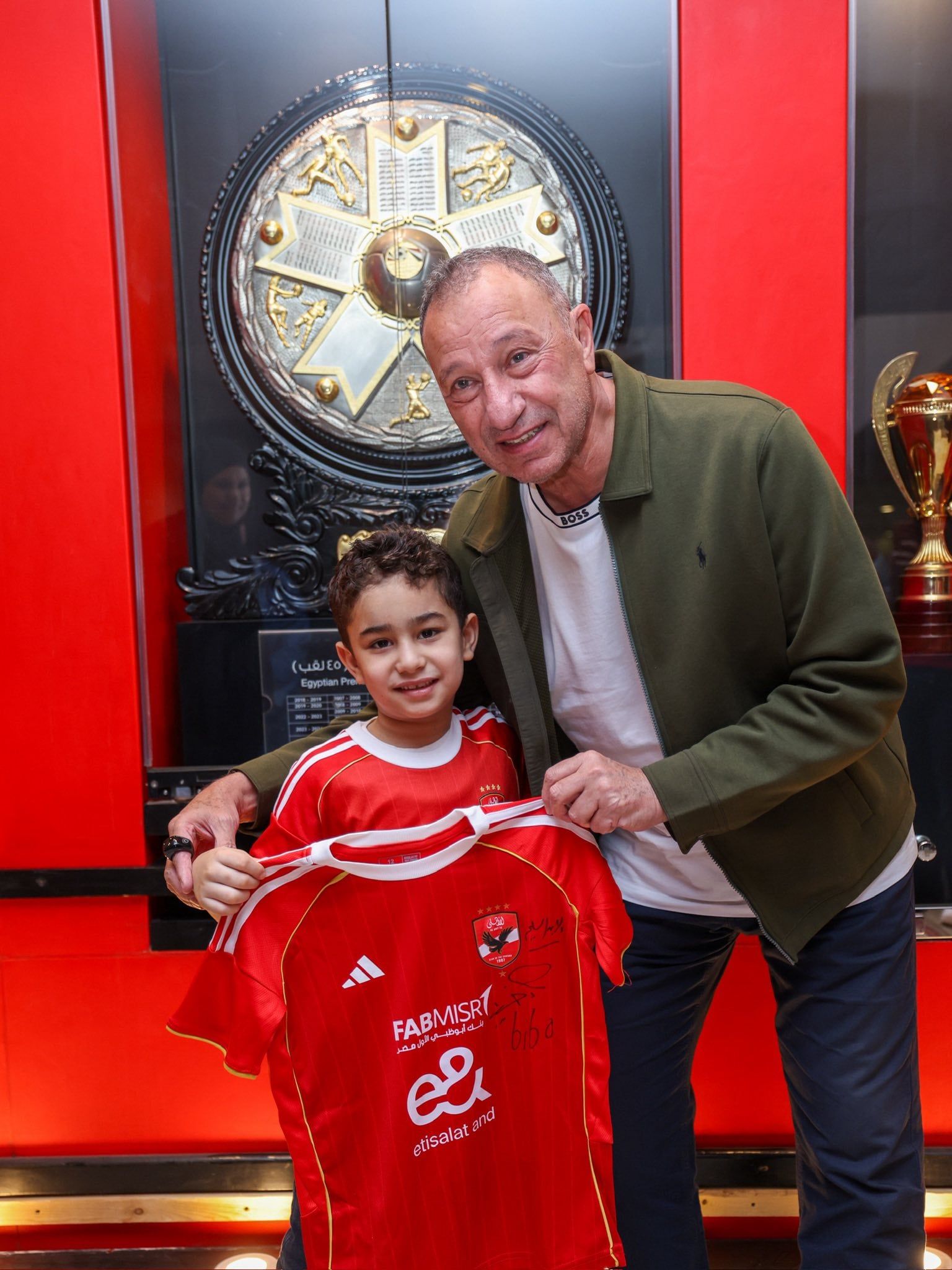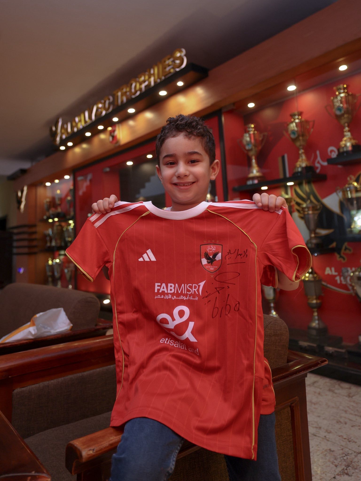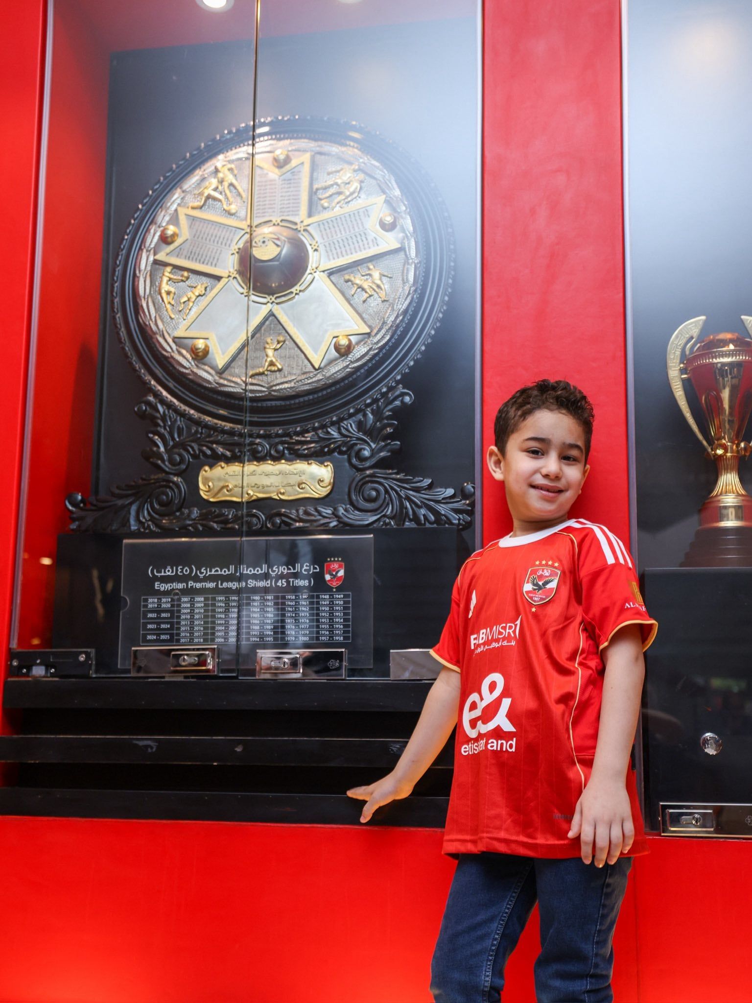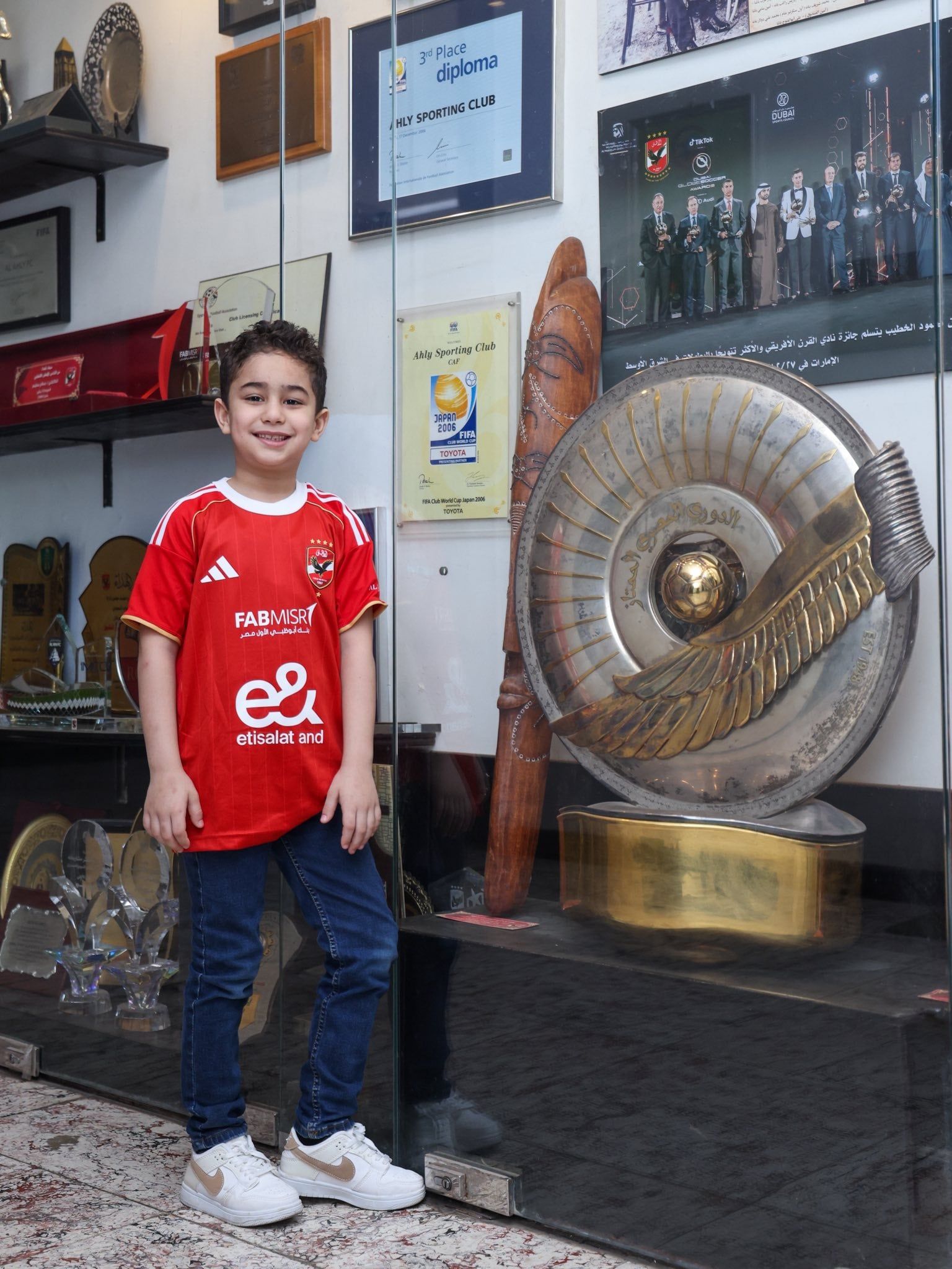 وحرص الطفل سليم أسامة على التقاط صور تذكارية داخل النادي الأهلي ومع الكئوس والدروع في مقر النادي بالجزيرة والحصول على القميص الموقع من محمود الخطيب.