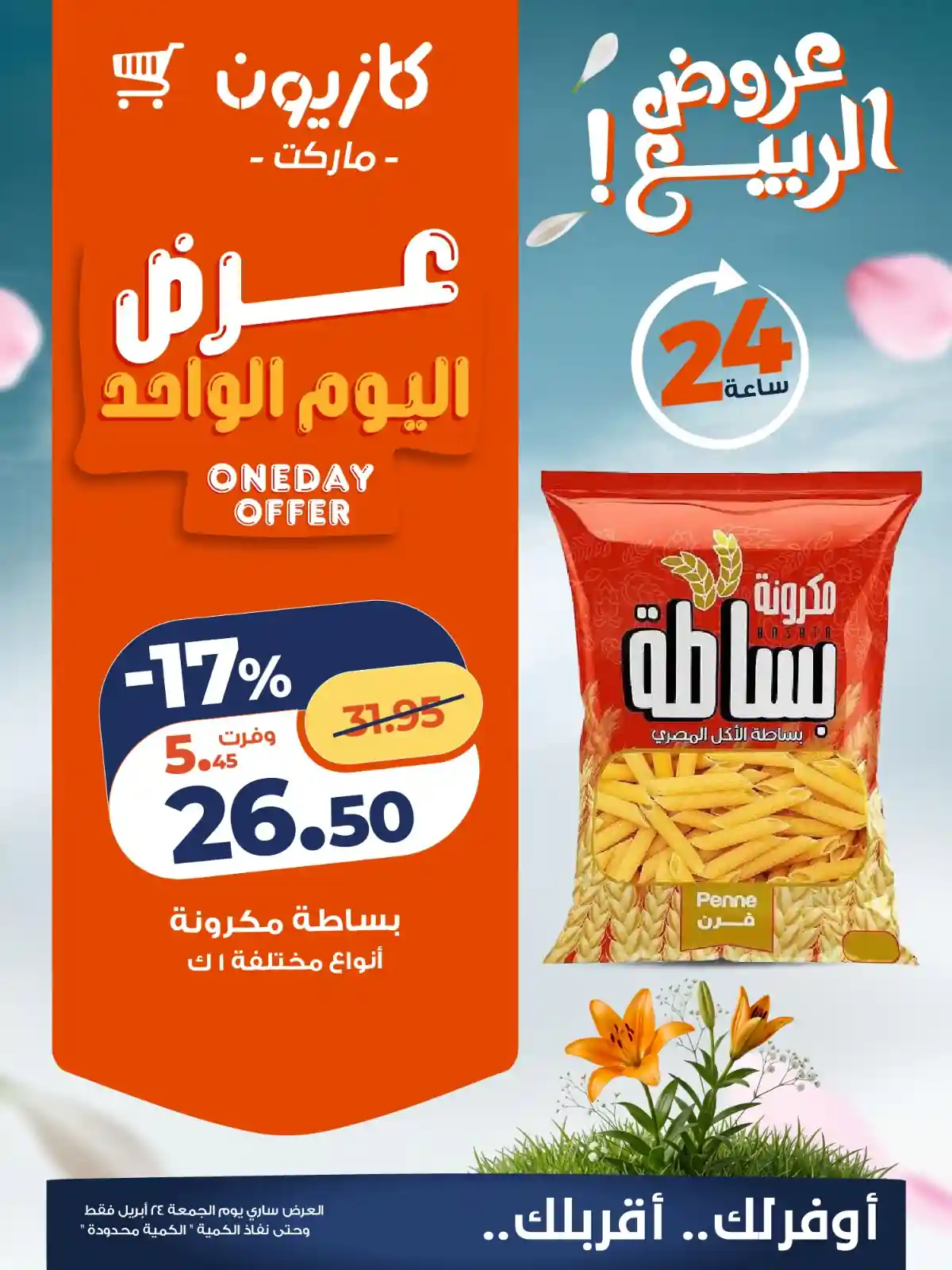اشتري احتياجات بيتك بأوفر سعر طول اليوم! العرض متاح يوم الجمعة 24 أبريل فقط وحتى نفاذ الكمية “الكمية محدودة”. زورونا في أقرب فرع