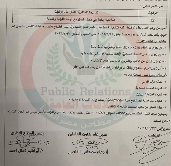 فعلى من يرغب العمل بهذه الوظيفة عليه التقدم شخصيا بطلب باسم السيد المهندس/ رئيس قطاع الأقصر وعنوانه الأقصر - كوبري ابو الجود وذلك خلال المدة من يوم الأحد الموافق ٢٠٢٦/٤/٢٦ حتى الخميس الموافق ٢٠٢٦/٤/٣٠
