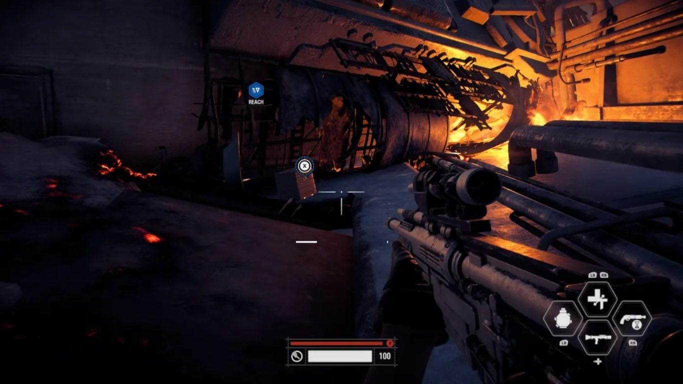 بعد الانتهاء من منطقة البطاريات، يتعين عليك الانعطاف إلى اليمين من أجل إيجاد مدخل إلى داخل السفينة. تواجه في هذا المسار عددًا كبيرًا جدًا من الأعداء المنتشرين في المكان، لذلك التزم باستخدام أماكن الاحتماء بشكل مستمر، وتقدّم بالسرعة التي تراها مناسبة دون استعجال. تعامل مع الأعداء تدريجيًا، وعندما تصبح الفرصة متاحة، اصعد فوق الحطام الموجود أمامك واستغلّه للوصول إلى فتحة الدخول، ثم ادخل إلى داخل السفينة.