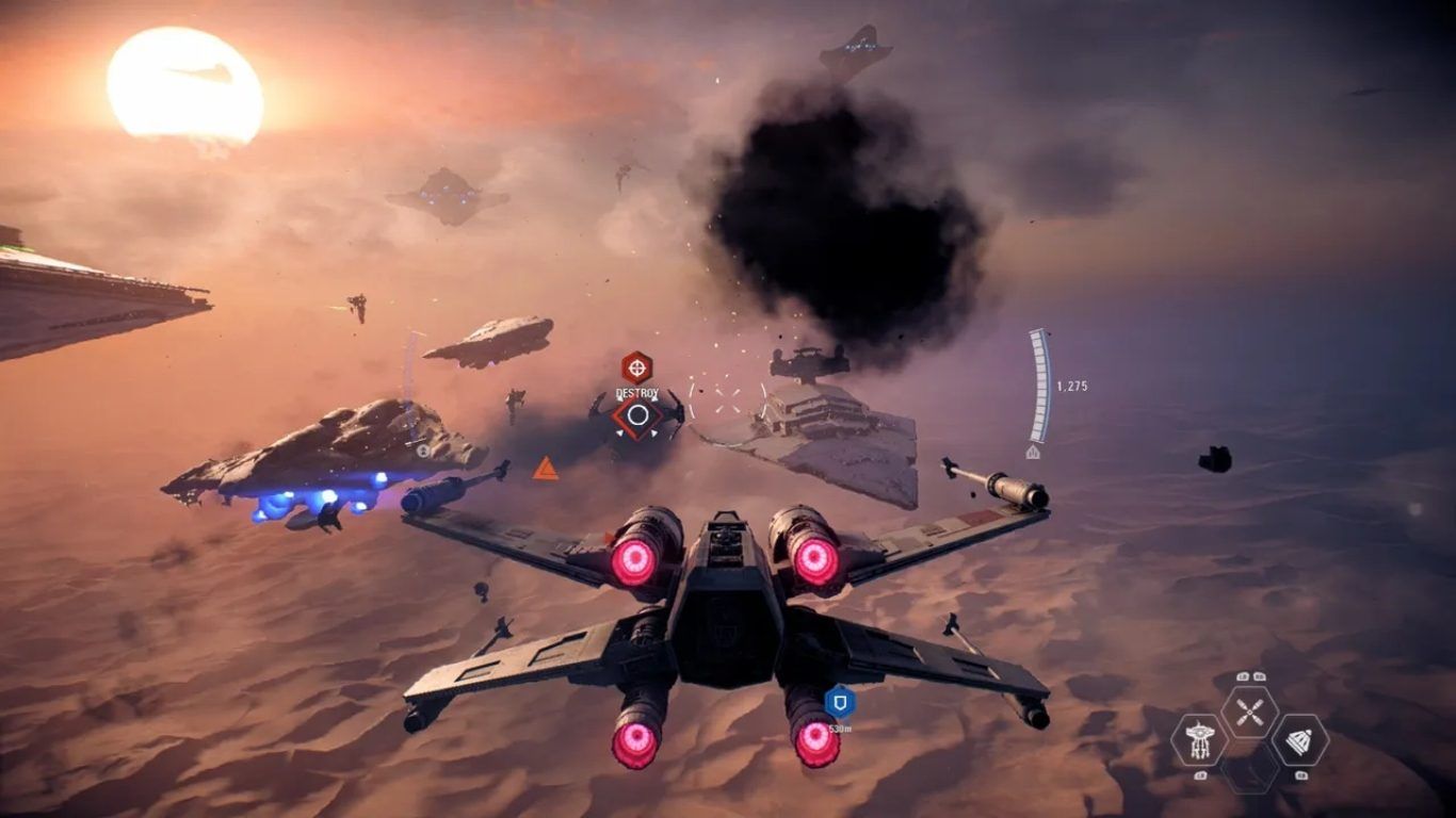 تجد نفسك الآن على الهيكل الخارجي للسفينة، حيث تتحول المواجهة من قتال جوي إلى اشتباك مباشر على السطح. ابدأ بالتقدم عبر الهيكل، مع الحفاظ على حذرك من البيئة المحيطة ومن القوات المعادية المنتشرة في المكان. كلما اقتربت من المدافع الرئيسية للمدمرة النجمية، تزداد شدة المقاومة بشكل ملحوظ.