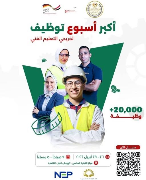 خلال الفترة من الأحد 26 إلى الأربعاء 29 أبريل 2026، بمركز التجارة العالمي بالقاهرة، وذلك بالتعاون مع الوكالة الألمانية للتعاون الدولي (GIZ)، واتحاد الصناعات المصرية، وشراكة دعم التوظيف.