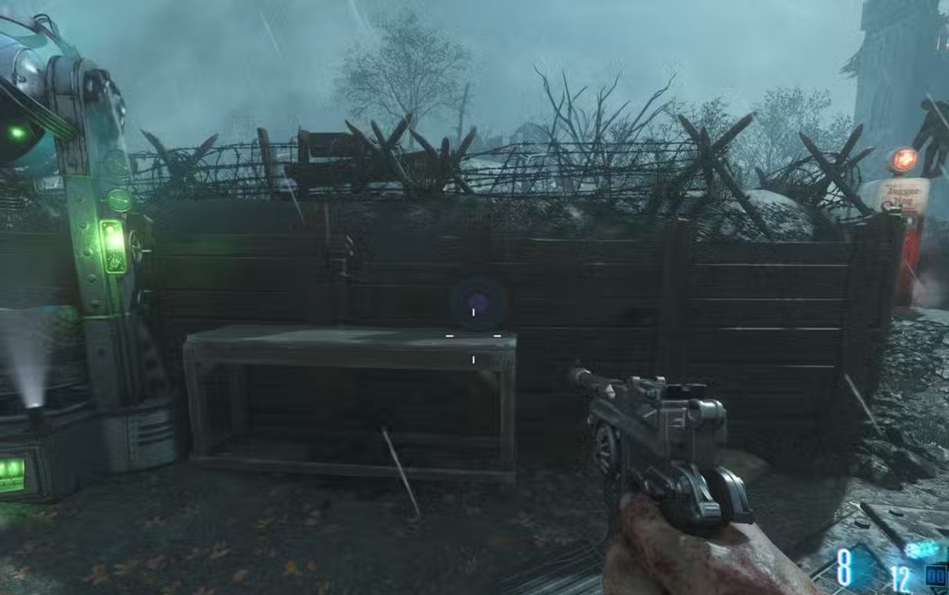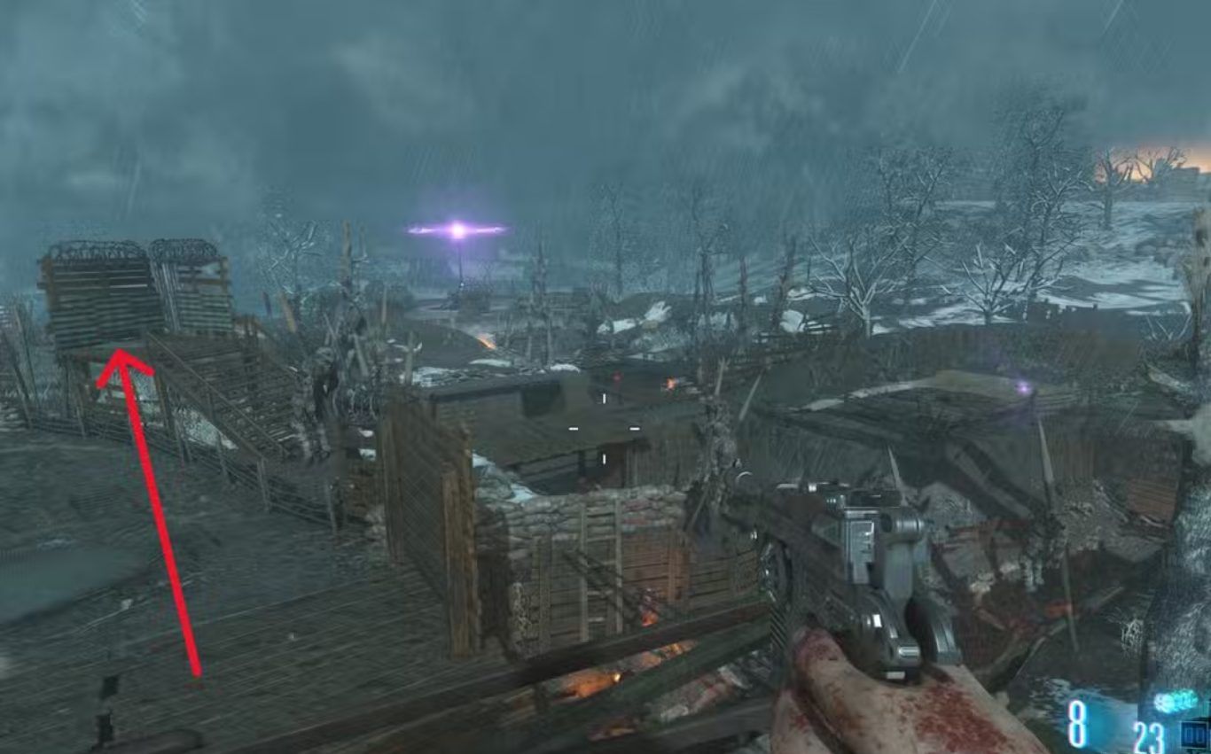 أما الجزء الثاني فيوجد أثناء المرور بجوار Excavation. وفي هذه المرحلة يجب أن تراقب الجهة اليسرى بعناية وعندما ترى مكان شراء سلاح MP 40 من الجدار يكون ذلك هو المؤشر الذي يخبرك أن لحظة القفز اقتربت. وعندها يجب أن تقفز بسرعة نحو الممر الخشبي المرتفع ثم تصعد إليه لتلتقط الجزء التالي. وهذه النقطة بالذات تحتاج إلى دقة في الملاحظة لأن التوقيت فيها مهم جدا وقد تضيع بسهولة إذا كنت مشغولا بالزومبي أو غير منتبه إلى المشهد المحيط بك أثناء حركة Tank.