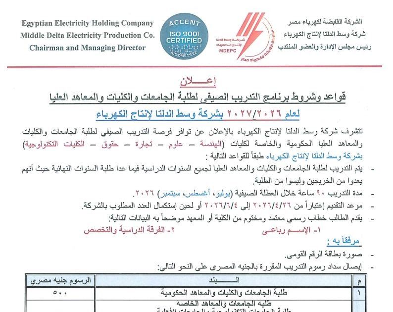 إعلان قواعد وشروط برنامج التدريب الصيفي لطلبة الجامعات والكليات والمعاهد العليا لعام 2026/ 2027 بشركة وسط الدلتا لإنتاج الكهرباء