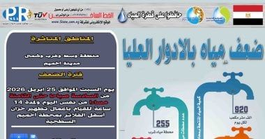 الجمعة، 24 أبريل 2026 04:30 مأعلنت شركة مياه الشرب والصرف الصحى بسوهاج عن ضعف المياه بالأدوار العليا بوسط وشمال وغرب مدينة أخميم غدا السبت، فى تمام السادسة صباحا وحتى الثامنة مساء من نفس اليوم ولمدة 14 ساعة، صرح بذلك المهندس محمد صلاح الدين عبد الغفار رئيس مجلس الإدارة والعضو المنتدب، وأضاف أنه يتم خلال تلك الفترة القيام بأعمال تطهير خزان أسفل الفلاتر بمحطة مياه أخميم السطحية.