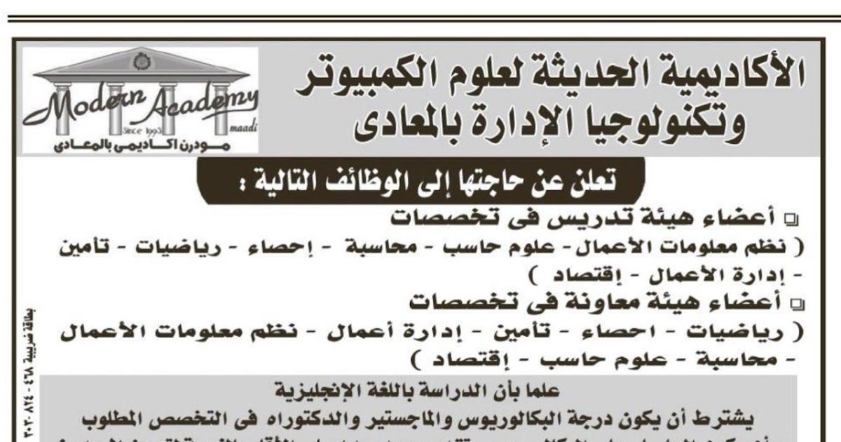 الأكاديمية الحديثة لعلوم الكمبيوتر وتكنولوجيا الإدارة بالمعادي تعلن عن حاجتها إلى الوظائف التالية: