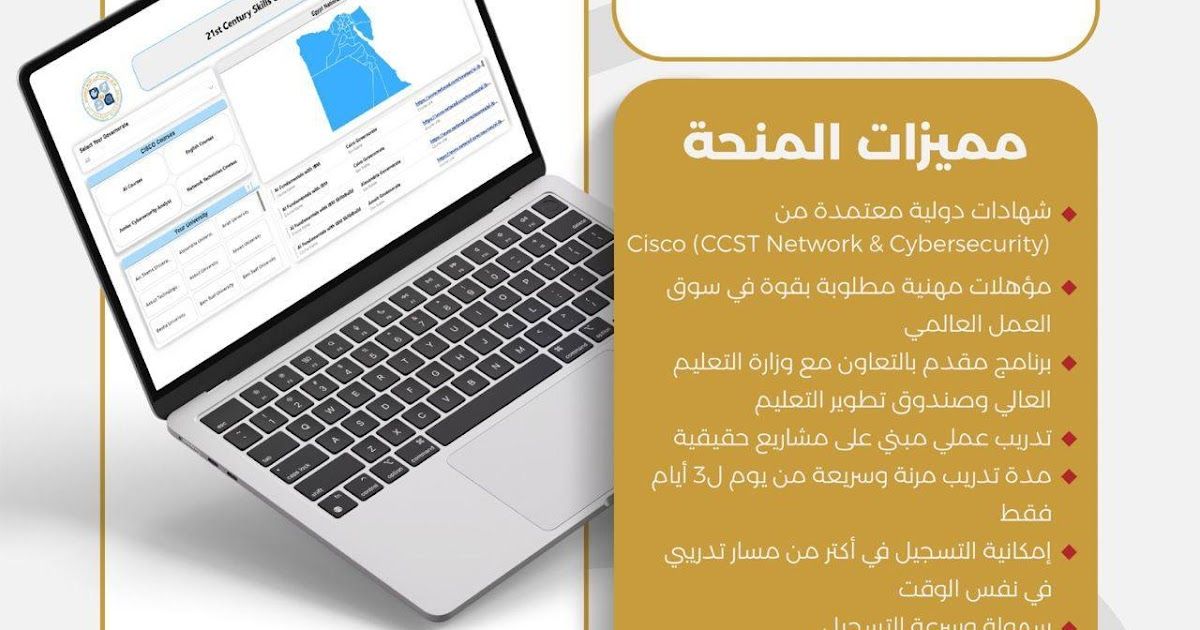 في إطار توجيهات القيادة السياسية بالاستثمار في رأس المال البشري وتعزيز جاهزية الشباب لسوق العمل، يعلن صندوق تطوير التعليم التابع لرئاسة مجلس الوزراء، بالتعاون مع وزارة التعليم العالي والبحث العلمي، ومن خلال مبادرة «كن مستعداً»، عن إتاحة 300 منحة تدريبية مجانية لطلاب الجامعات والخريجين، وذلك بالتعاون مع شركة سيسكو العالمية، بهدف تأهيلهم في مجالات التكنولوجيا الحديثة ومنحهم شهادات احترافية معترف بها دولياً.