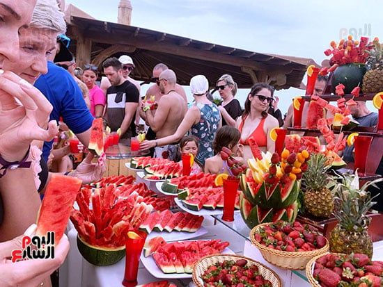 السبت، 25 أبريل 2026 06:46 متحرص الفنادق السياحية بمحافظة البحر الأحمر على استغلال موسم ظهور الفواكه الصيفية مع بداية فصل الصيف وارتفاع درجات الحرارة نسبيًا، حيث يتم تنظيم مهرجانات خاصة بهذه الفواكه، والتي بدأت بمهرجان البطيخ والفرولة وفى انتظار المانجو، إذ تنطلق فعالياته بفنادق مدينة الغردقة ومرسى علم وسط أجواء احتفالية مميزة.