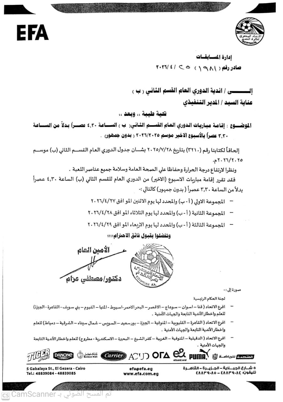 قررت لجنة المسابقات باتحاد الكرة تأخير مباريات الجولة الأخيرة بدورى القسم الثانى لمدة ساعة بحيث تقام في الرابعة والنصف عصرا بدلا من الثالثة والنصف .