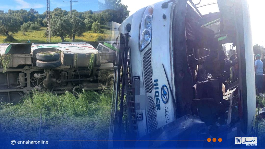 وحسب بيان للحماية المدنية تدخلت على الساعة 15:20 أجل حادث انحراف وانقلاب حافلة لنقل المسافرين تشغل خط عنابةـ حجر الديس.