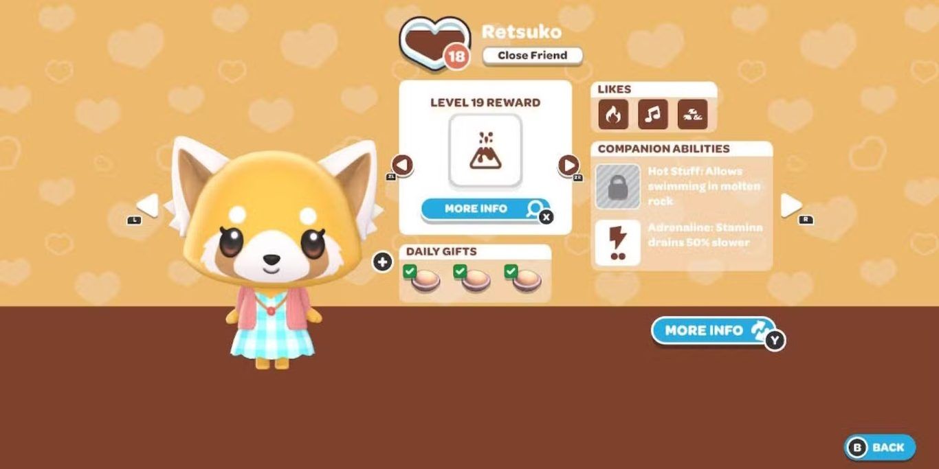 Hello Kitty المستوى 2 والمستوى 12 Sous Chef: يمنح فرصة بنسبة 50% للحصول على عنصر طعام إضافي عند الطهي. Everyone’s Friend: يزيد سرعة رفع مستوى الصداقة مع باقي السكان بنسبة 10%. My Melody المستوى 4 والمستوى 9 Big Smile: يزيد نسبة حصول شخصية أخرى على هدية مكافأة إضافية. Handy Helper: يقلل تكلفة إصلاح الكبائن بمقدار صندوق Strawberry Crate واحد. Chococat المستوى 5 والمستوى 10 Master Crafter: يمنح فرصة بنسبة 30% لصنع عنصر إضافي عند التصنيع. Tour Guide: يقدم تلميحات أثناء محاولة إكمال غرف الألغاز. Tuxedosam المستوى 7 والمستوى 13 Fashionista: يزيد قوة الأزياء التي يرتديها اللاعب، ويعمل حاليًا فقط مع زي حورية البحر. Negotiator: يمنح فرصة بنسبة 25% للحصول على عنصر إضافي عند التبادل في المتاجر. Badtz-maru المستوى 5 والمستوى 9 Fish Whisperer: يمنح حظًا أفضل أثناء الصيد. Gamer: يمنح اللاعب تذكرة مجانية واحدة يوميًا للعب الألعاب المصغرة في الجزيرة. Pochacco المستوى 8 والمستوى 14 Speed Walker: يسمح للاعبين بالتنقل بشكل أسرع أثناء المشي في الجزيرة. Relay: يساعد Pochacco في إكمال التحديات المنتشرة في الجزيرة. Keroppi المستوى 6 والمستوى 9 Critter Calmer: يجعل اصطياد الكائنات الصغيرة أسهل. Critter Friend: يمنح فرصة بنسبة 25% لعدم فزع الكائنات أو هروبها أثناء محاولة اصطيادها. Kuromi المستوى 13 والمستوى 16 Witchcraft: يزيد تأثير الجرعات. Super Ballon: تمنح Kuromi زيادة في الارتفاع عند استخدام البالونات. Cinnamoroll المستوى 18 Soar: يسمح للاعبين بالطيران أو الانزلاق لمدة أطول. لا توجد قدرة ثانية. Pekkle المستوى 7 والمستوى 13 Speed Climber: يسمح للاعبين بالتحرك بسرعة أكبر قليلًا أثناء التنقل. Dance All Night: يغير Pekkle وقت اليوم حسب طلب اللاعب. Pompompurin المستوى 5 والمستوى 12 Pudding Pants: يسمح للاعبين بالقفز إلى ارتفاع أعلى. Slow & Steady: يمنح اللاعبين 5 ثوانٍ إضافية لإكمال التحديات. Retsuko المستوى 16 والمستوى 19 Hot Stuff: يسمح للاعبين بالسباحة في الصخور المنصهرة. Adrenaline: يعيد شحن طاقة التحمل لدى اللاعبين بشكل أسرع. Hangyodon المستوى 5 والمستوى 10 Speed Swimmer: يسمح للاعبين بالسباحة بشكل أسرع. Fish Friend: يمنح زيادة بنسبة 25% في فرصة اصطياد سمكة نادرة. Wish Me Mell المستوى 11 والمستوى 13 Master Gardener: يمنح فرصة للحصول على بذرة إضافية عند استخدام Seed Dispenser. Precision Play: يؤدي اصطحاب Wish Me Mell أثناء لعب Crane Craze إلى إبطاء حركة الجوائز بنسبة 25%. My Sweet Piano المستوى 13 والمستوى 16 والمستوى 19 Master Interior Designer: يقلل تكلفة تخصيص الأثاث بنسبة 10%. لا توجد قدرة ثانية. Usahana المستوى 4 والمستوى 19 Chef’s Kiss: يمنح فرصة بنسبة 25% للحصول على عنصر طعام إضافي عند الطهي في Chef’s Station. Super Service: يمنح فرصة بنسبة 20% للحصول على Cafe Coin إضافية عند خدمة الزبائن في Imagination Cafe. Tophat المستوى 9 Pickup Glitch: يمنح فرصة بنسبة 10% للحصول على عنصر إضافي أثناء الجمع. لا توجد قدرة ثانية. Big Challenges المستوى 19 Vacuum: يتم التقاط العناصر تلقائيًا أثناء الجمع إذا كان اللاعب قريبًا بما يكفي. لا توجد قدرة ثانية. Kiki إكمال مهمة Together Forever Meteorology: يقلل الوقت بين تغيّرات الطقس بنسبة 50%. لا توجد قدرة ثانية. Lala إكمال مهمة Together Forever Meteorology: يقلل الوقت بين تغيّرات الطقس بنسبة 50%. لا توجد قدرة ثانية.