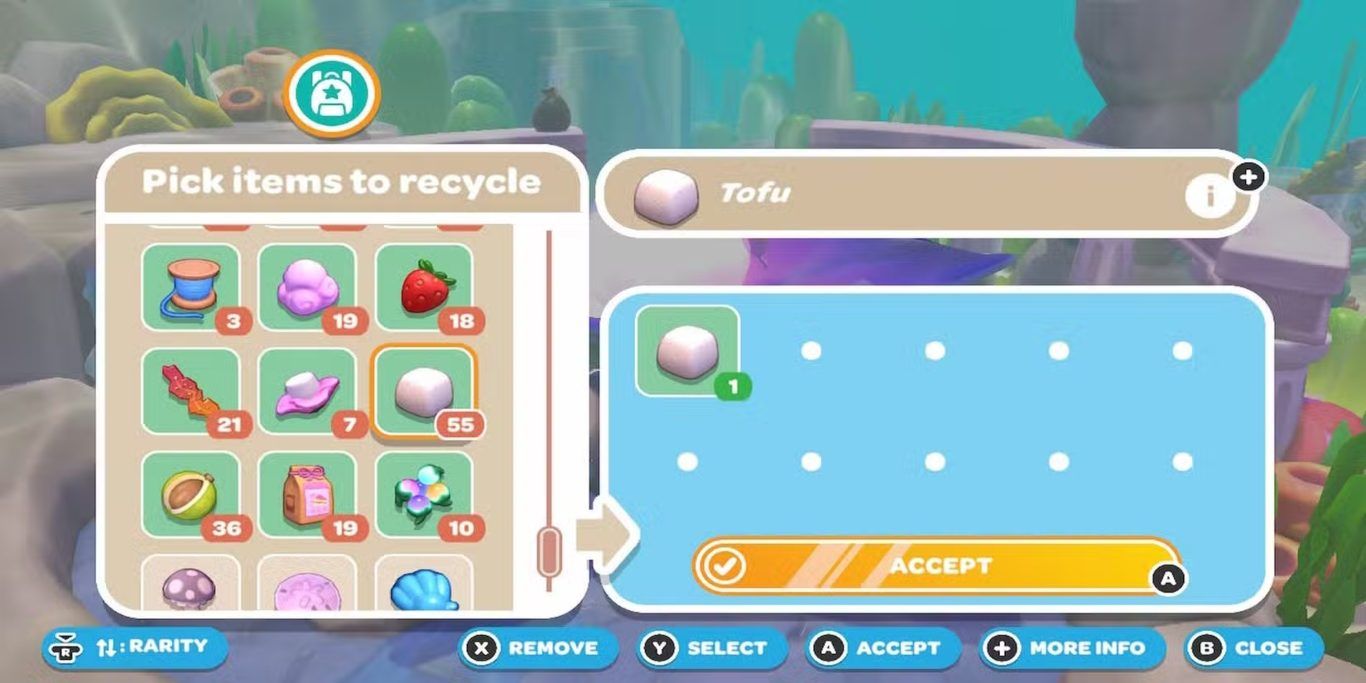 بمجرد أن يفتح اللاعبون مصنع إعادة التدوير، ستظهر قائمة مثل هذه، حيث يحتاج اللاعبون إلى تحديد العناصر التي يرغبون في وضعها داخله. لا تعد هذه طريقة جيدة للتخلص من العناصر التي لا يريدها اللاعبون فقط، بل تساعد اللاعبين أيضًا في الحصول على الصبغة.