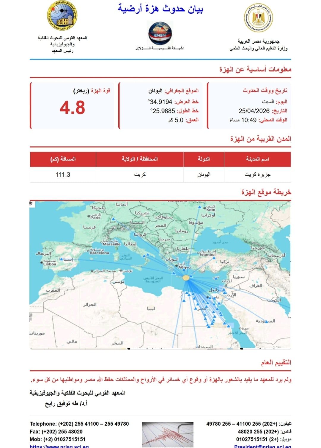 الأحد، 26 أبريل 2026 12:39 ص أعلن المعهد القومي للبحوث الفلكية والجيوفيزيقية (الشبكة الوطنية للزلازل)، تسجيل هزة أرضية مساء أمس السبت الموافق 25 أبريل 2026، بلغت قوتها 4.8 درجة على مقياس ريختر، وذلك في تمام الساعة 10:49 مساءً بالتوقيت المحلي لمدينة القاهرة.