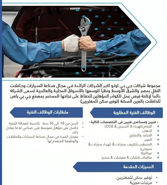 مجموعة شركات جي بي اوتو اكبر الشركات الرائدة في مجال صناعة السيارات وحافلات النقل بمصر والشرق الأوسط ونظراً لتوسعها بالأسواق المحلية والعالمية تسعى الشركة دائماً لإتاحة فرص عمل للكوادر المؤهلين للحفاظ على نجاحها المستمر بمصنع جي بي باص للحافلات بالعين السخنة (توفير سكن للمغتربين)