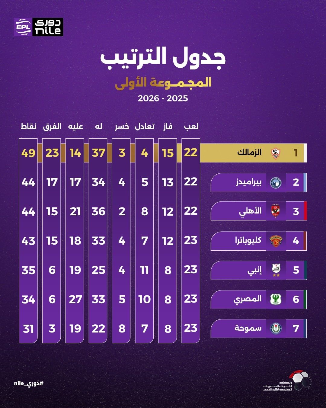 الزمالك يتربع على قمة الدوريويتربع الزمالك على صدارة جدول مجموعة التتويج برصيد 49 نقطة قبل إنطلاق الجولة الرابعة لمنافسات مجموعة التتويج، بينما يأتي بيراميدز في الوصافة برصيد 44 نقطة وهو نفس رصيد الأهلي.