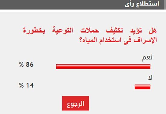 وأيد 85% من القراء مطالب تكثيف حملات التوعية بخطورة الإسراف فى استخدام المياه، بينما عارض 15% من القراء مطالبهل تؤيد تكثيف حملات التوعية بخطورة الإسراف فى استخدام المياه.