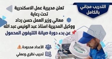 الأحد، 26 أبريل 2026 09:00 صأعلنت مديرية عمل الاسكندرية، عن تنظيم دورة تدريبيه حول صيانة التليفون المحمول تحت رعاية وزير العمل حسن رداد ، ووكيل المديرية عبد الونيس عبد الله ، واوضحت المديرية أن التدريب مجاني بالكامل ، وهو تدريب نظري وعملي ، مع الحصول على شهادة معتمدة.