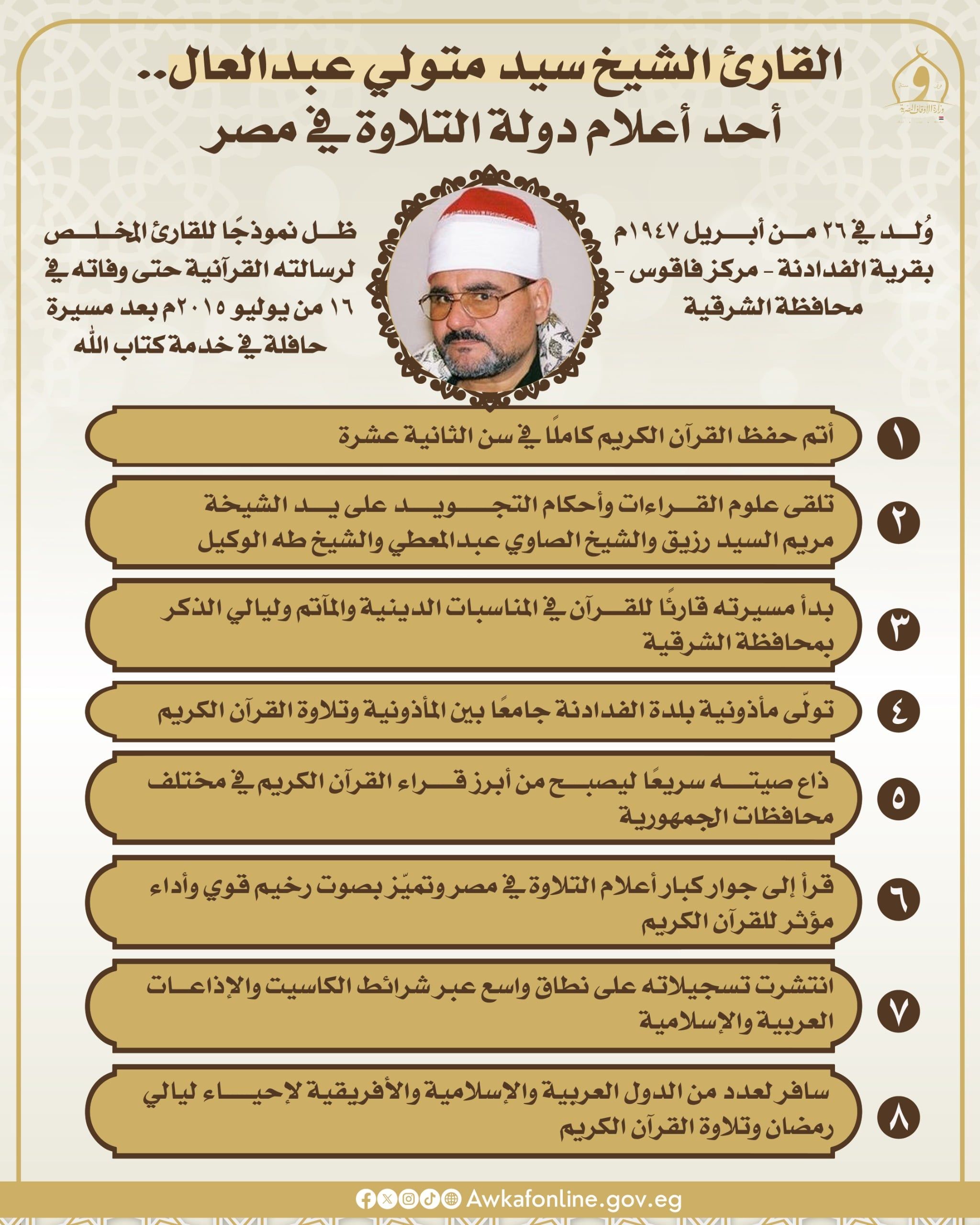 وإذ تستحضر وزارة الأوقاف هذه الذكرى العطرة، فإنها تؤكد اعتزازها بأعلام دولة التلاوة الذين حملوا رسالة القرآن الكريم أداءً ودعوةً وتأثيرًا، وأسهموا في ترسيخ القيم الإيمانية ونشر جمال التلاوة المصرية الأصيلة، سائلين الله عز وجل أن يتغمده بواسع رحمته وأن يجعل ما قدمه في ميزان حسناته.