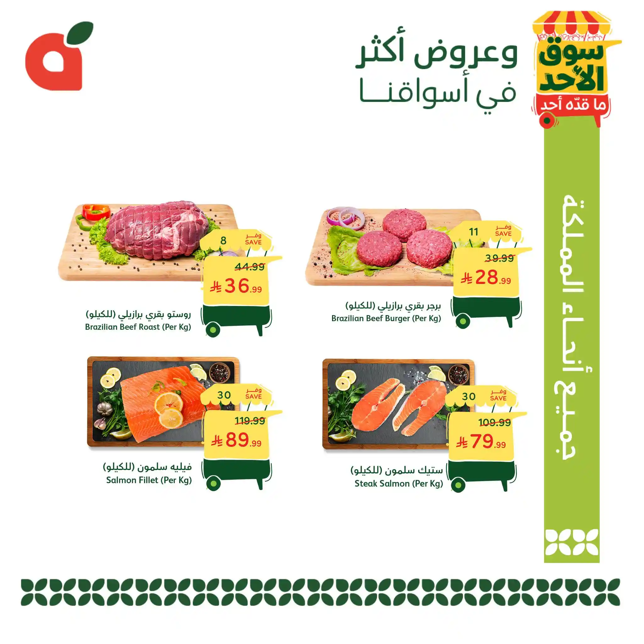 طازجة، أوفر، وبأفضل جودة ????! زورنا اليوم واستفيد من عروض سوق الأحد ماقده أحد ????. تسري هذه العروض لمدة يوم واحد فقط، الأحد 26 أبريل 2026 أو حتى نفاد الكمية في جميع أنحاء المملكة.