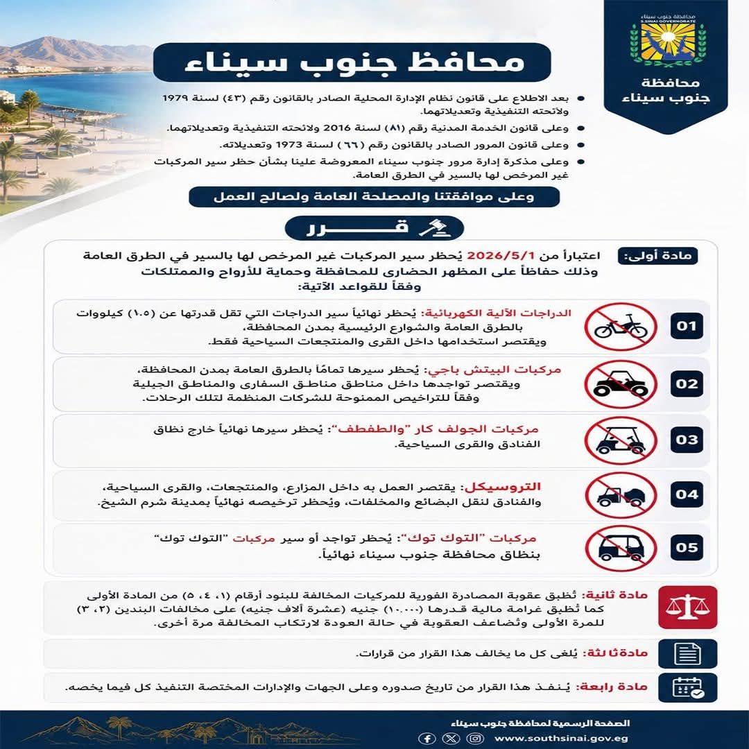 الأحد، 26 أبريل 2026 11:12 صأصدر اللواء الدكتور إسماعيل كمال، محافظ جنوب سيناء، قرارًا بتنظيم حركة المركبات داخل نطاق المحافظة، يتضمن حظر سير المركبات غير المرخصة على الطرق العامة، اعتبارًا من 1 مايو 2026، وذلك حفاظًا على المظهر الحضاري وتعزيزًا لمعدلات السلامة.