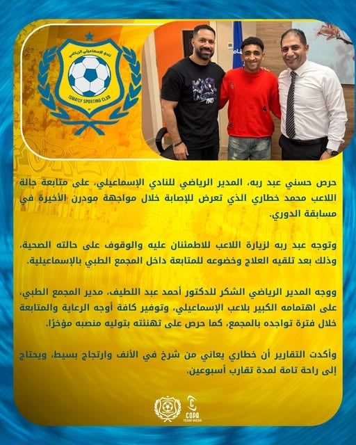 وتوجه عبد ربه لزيارة اللاعب للاطمئنان عليه والوقوف على حالته الصحية، وذلك بعد تلقيه العلاج وخضوعه للمتابعة داخل المجمع الطبي بالإسماعيلية.