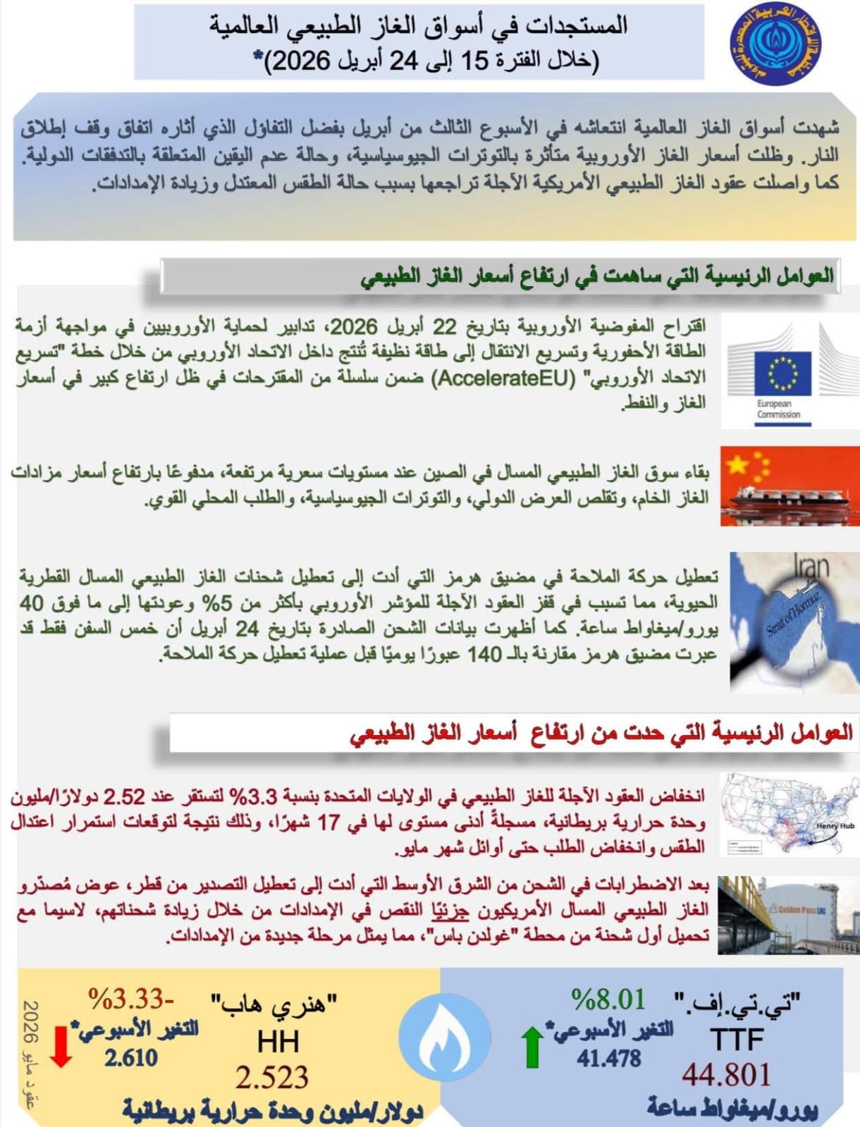 الأحد، 26 أبريل 2026 02:39 مشهدت أسواق الغاز العالمية انتعاشه في الأسبوع الثالث من أبريل بفضل التفاؤل الذي أثاره اتفاق وقف إطلاق النار وظلت أسعار الغاز الأوروبية متأثرة بالتوترات الجيوسياسية، وحالة عدم اليقين المتعلقة بالتدفقات الدولية كما واصلت عقود الغاز الطبيعي الأمريكية الأجلة تراجعها بسبب حالة الطقس المعتدل وزيادة الإمدادات.