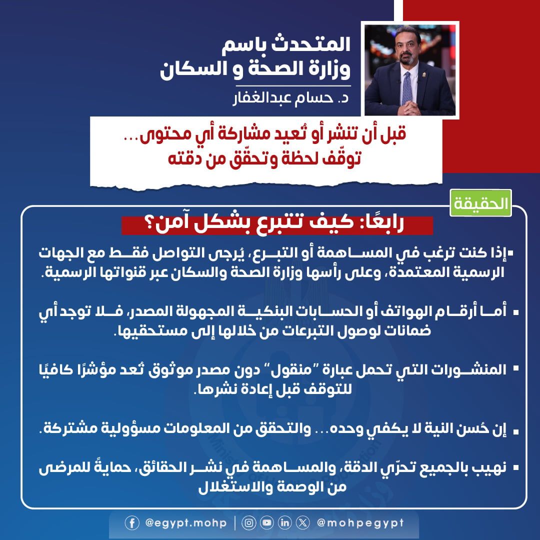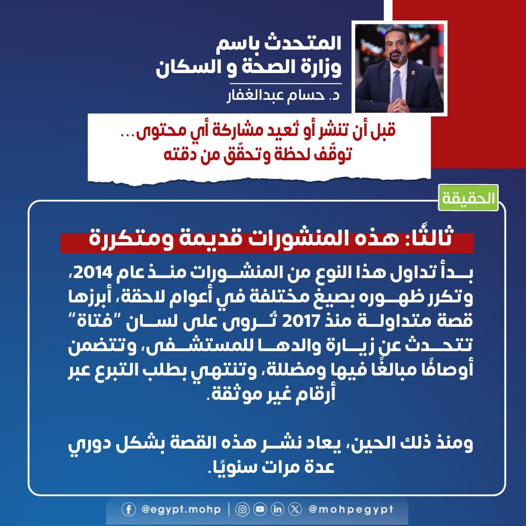 وأضاف أن هذه النوعية من المنشورات ليست جديدة، حيث بدأ تداولها منذ عام 2014، وتتكرر بشكل دوري، خاصة قصة متداولة منذ 2017 تتضمن روايات مبالغ فيها وتنتهي بطلب التبرع عبر وسائل غير موثقة.