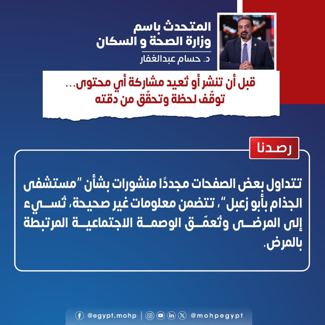 الأحد، 26 أبريل 2026 04:36 مأكد الدكتور حسام عبد الغفار، المتحدث الرسمي باسم وزارة الصحة والسكان، ضرورة تحرى الدقة قبل نشر أو إعادة تداول أى محتوى يتعلق بالمنظومة الصحية، خاصة ما يتم تداوله بشأن مرض الجذام ومستشفى أبو زعبل.