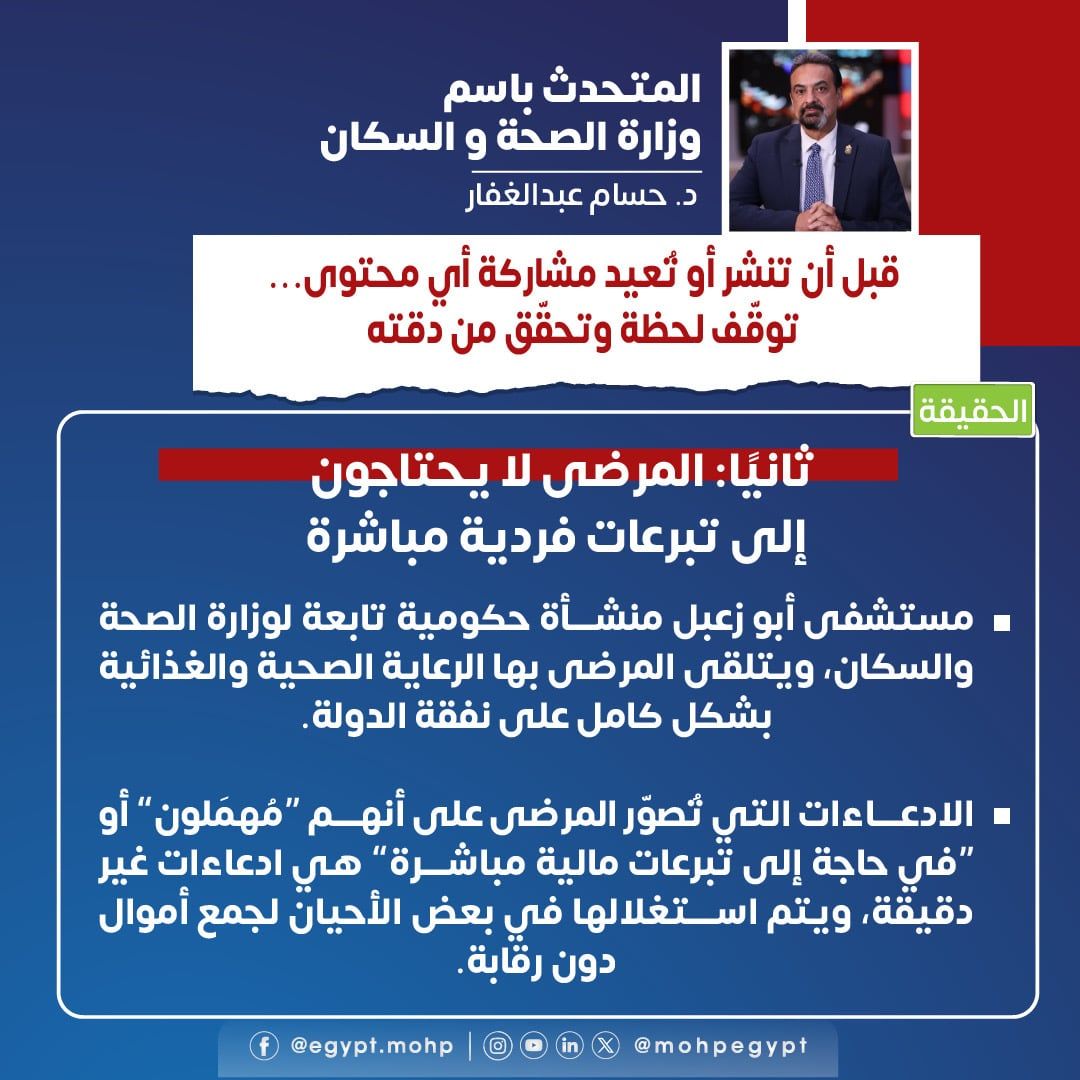 ما يُنشر حول احتياج المرضى لتبرعات مالية مباشرة غير دقيقوفيما يتعلق بما يتم تداوله حول مستشفى الجذام بأبو زعبل، أشار إلى أن المنشأة تابعة لوزارة الصحة والسكان، ويتلقى المرضى بها الرعاية الصحية الكاملة، إلى جانب التغذية، على نفقة الدولة، مؤكدًا أن ما يُنشر حول احتياج المرضى لتبرعات مالية مباشرة غير دقيق، وقد يُستغل في جمع أموال بطرق غير خاضعة للرقابة.