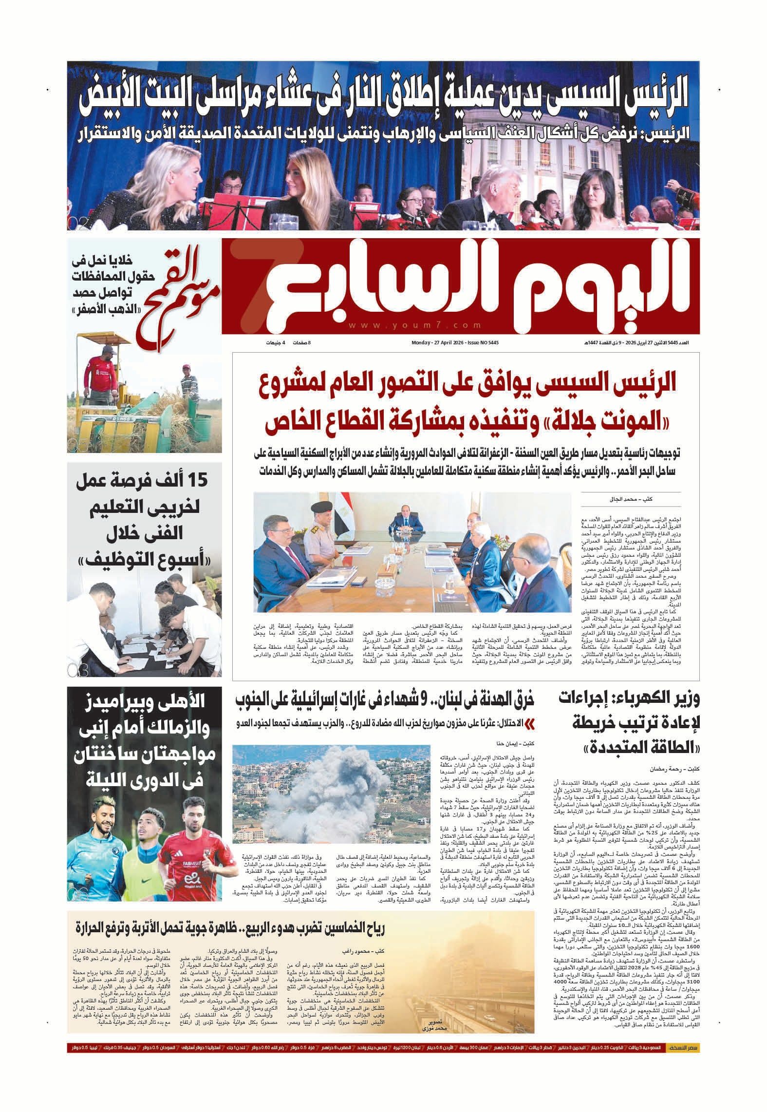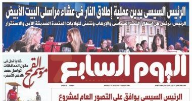 ينشر "اليوم السابع" فى عدده الصادر غدا، تفاصيل هامة حول العديد من الأحداث الجارية على الساحتين الداخلية والخارجية أبرزها: الرئيس السيسى يدين عملية إطلاق النار فى عشاء مراسلى البيت الأبيض.. الرئيس السيسى يوافق على التصور العام لمشروع "المونت جلالة".. وزير الكهرباء: إجراءات لإعادة ترتيب خريطة الطاقة المتجددة