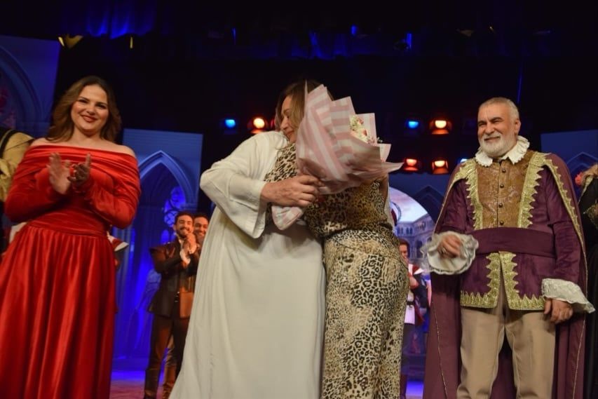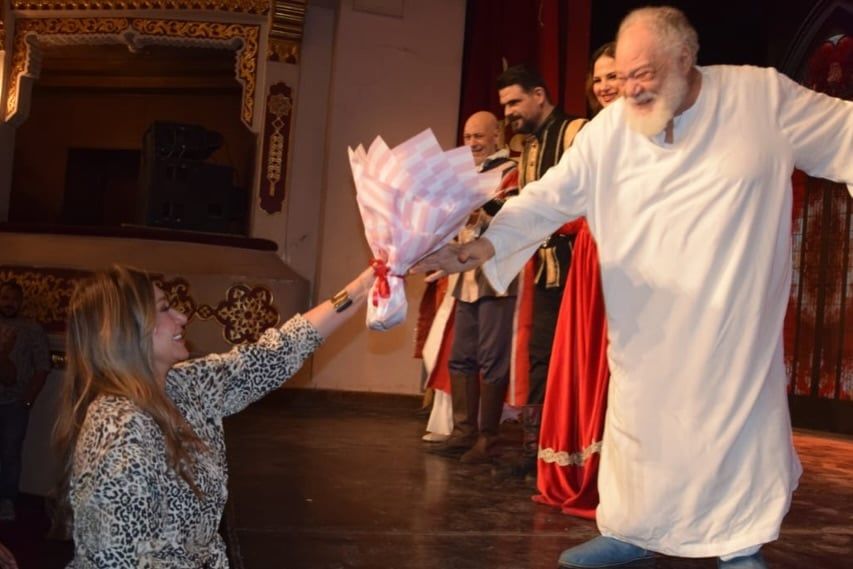 صعدت الفنانة الكبيرة ليلي علوي على المسرح حيث ظهرت خلال الفيديو وهي تثني على موهبة الفنان الكبير يحيى الفخراني وقامت بتقبيل يده ليرد عليها الفنان الكبير بتقبيل يدها أيضاً، واحتضنته وسط تصفيق الجمهور لفريق عمل المسرحية على ابداعهم الفني.