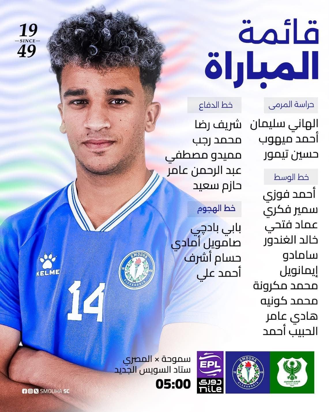 أعلن أحمد عبد العزيز، المدير الفني لنادي سموحة، عن قائمة الفريق الرسمية التي ستخوض مواجهة مهمة ضد نادي المصري البورسعيدي، والمقرر إقامتها غدًا في تمام الساعة الخامسة مساءً على أرضية ملعب ستاد السويس الجديد.