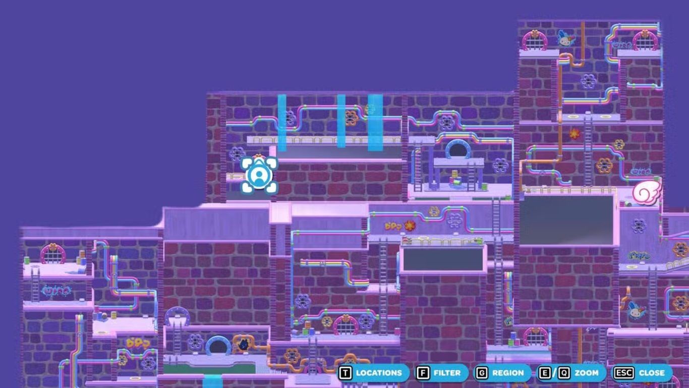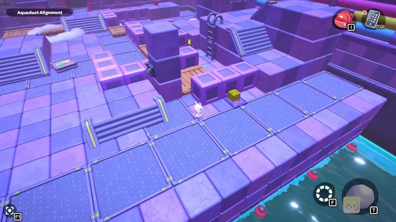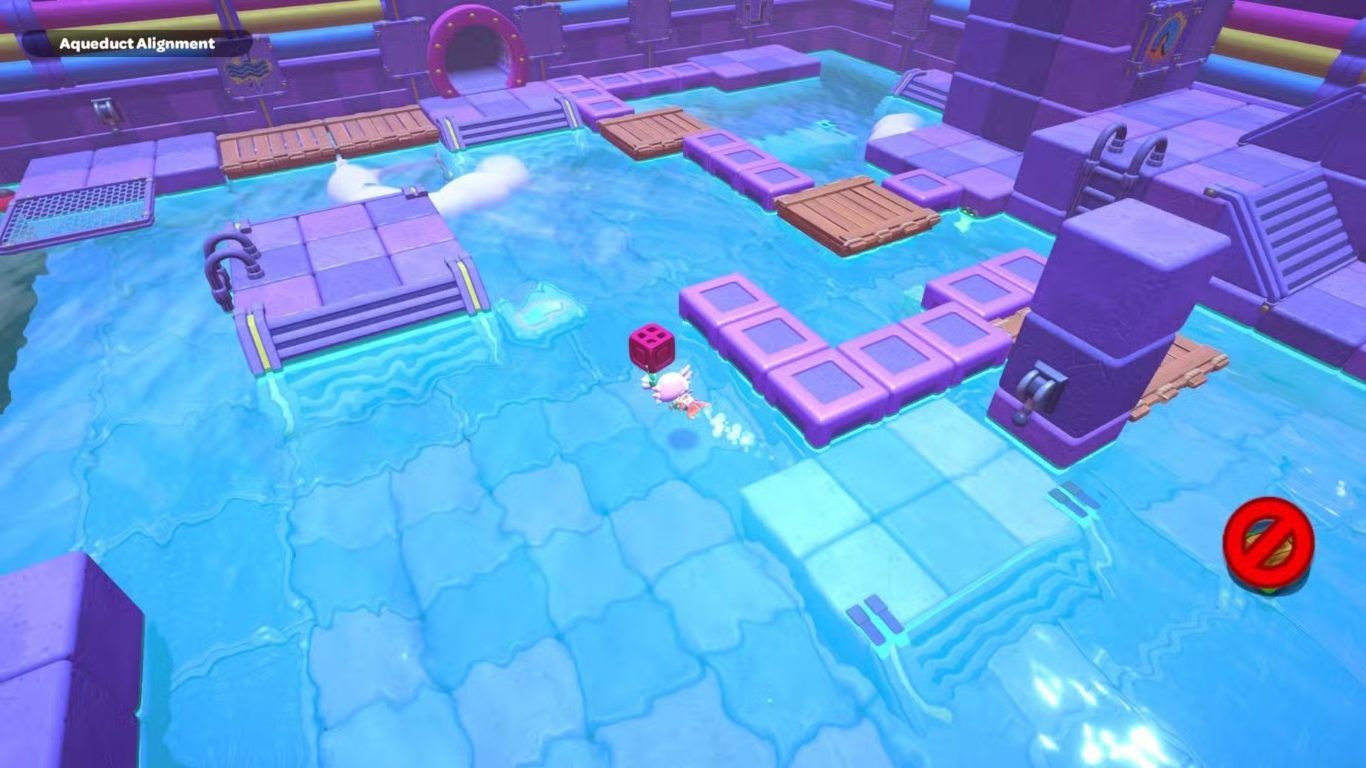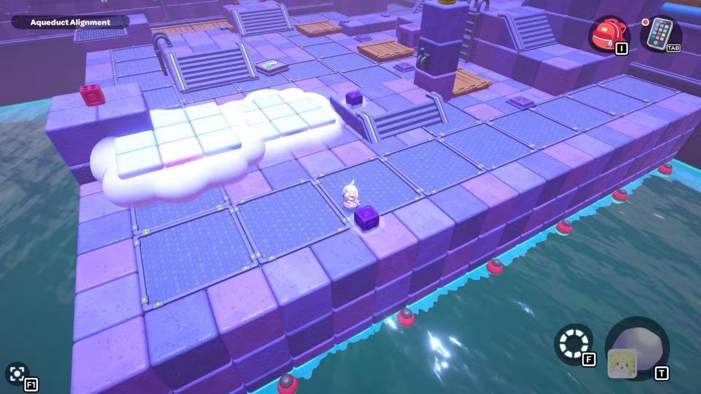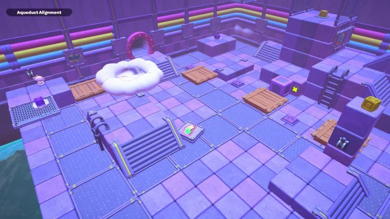 بعد ذلك، عد إلى إحدى الرافعتين داخل الغرفة وقم بخفض مستوى الماء مرة أخرى. اذهب إلى المفتاح البنفسجي البعيد في أقصى اليسار، والتقط المكعب البنفسجي الموجود عليه، ثم أحضره إلى المنصة المركزية التي تحتوي على الرافعة. قم بتوجيه هذا المكعب بحيث تصبح السحابة الخاصة به فوق الفجوة الموجودة في المسار الذي أنشأته سابقًا.